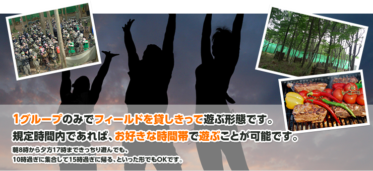 2 グループで決めた集合時間にフィールドにお集まりください。昼間の貸切につきましては、朝8時~夕方17時の中で自由にご利用ください。時間いっぱいに使って遊んでも、ちょっと遅めに集まって早く帰る、といった遊び方でもOKです。